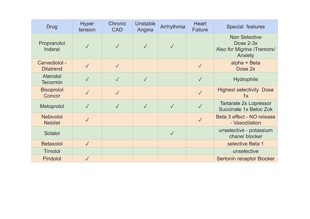 زي ما المواد الفعالة في البيتا بلوكرز متنوعة، استخداماتها العلاجية كمان متنوعة. بس مش كل مادة فعالة مناسبة لكل حالة، ومش كل مادة بتدي نفس الفايدة في كل حالة. الجدول بيوضح الاستخدامات المعتمدة لكل مادة فعالة والخصائص المميزة لكل دواء.