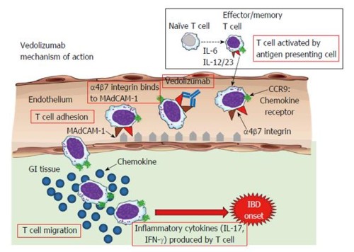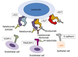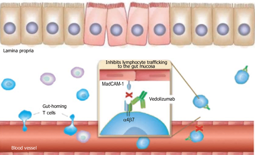 Entyvio أو Vedolizumab هو monoclonal antibody تم تطويره علشان يرتبط بشكل انتقائي بـIntegrin α4β7 ويمنعه من إنه يرتبط بالـLigand الموجود على خلايا الجهاز الهضمي. وده بيمنع الخلايا المناعية من إنها توصل لمكان الالتهاب وتسبب التقرحات.