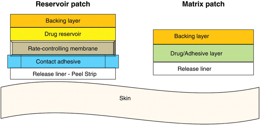 • المادة اللصقة نفسها عبارة عن مادة عالية اللزوجة . دا مخليها تعمل Matrix . المادة الفعالة بتخرج من ال Matrix للجلد بشكل سهل التحكم فيه