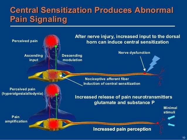 الجهاز العصبي المركزي (الحبل الشوكي والمخ) بيكون أكثر استثارة. إشارات الألم بتتصرف بشكل مبالغ فيه. عتبة الألم Pain threshold بتقل، يعني أي مؤثر بسيط بيعمل ألم قوي أو آلام بتحصل باللمس الخفيف (Allodynia)،