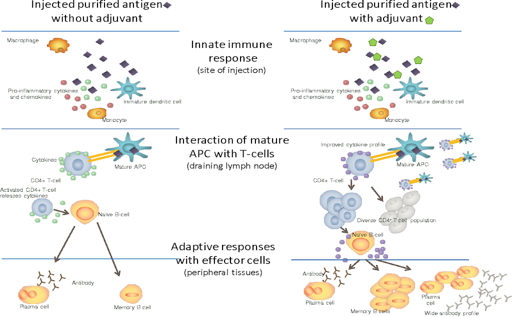 ١- عن طريق مادة مضافة تحفز الاستجابة المناعية و تسبب حساسية او Adjuvant في البداية كانت المادة دي بتكون من املاح الالومينيوم ولكن نظرا لانها على المدى الطويل اتضح انها استخدمها ليه تاثير سام على الاعصاب و ليها علاقة بامراض زي الزهايمر.