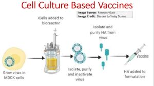 الحل في تطوير التطعيم في خلايا حية بس خارج الجسم او زي ما بنسميها Cell based vaccine . الخلايا المستخدمة بتكون مستخلصة من الكلى بتاعة الكلاب و ممكن تتزرع و تكاثر في المعمل و الفيروس ممكن يتكاثر فيها بسرعة وبدون الحاجة للبيض. النوع دا لحد وقتنا الحالي اغلى في التكلفة و مقتصر بس على المرضى اللي عندهم حساسية من البيض و بينزل باسم Flucelvax من CSL – Seqirus على شكل Surface antigen Subunit vaccine.