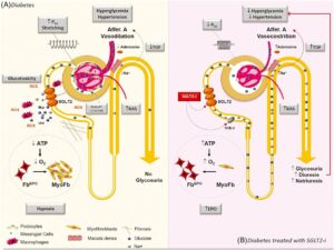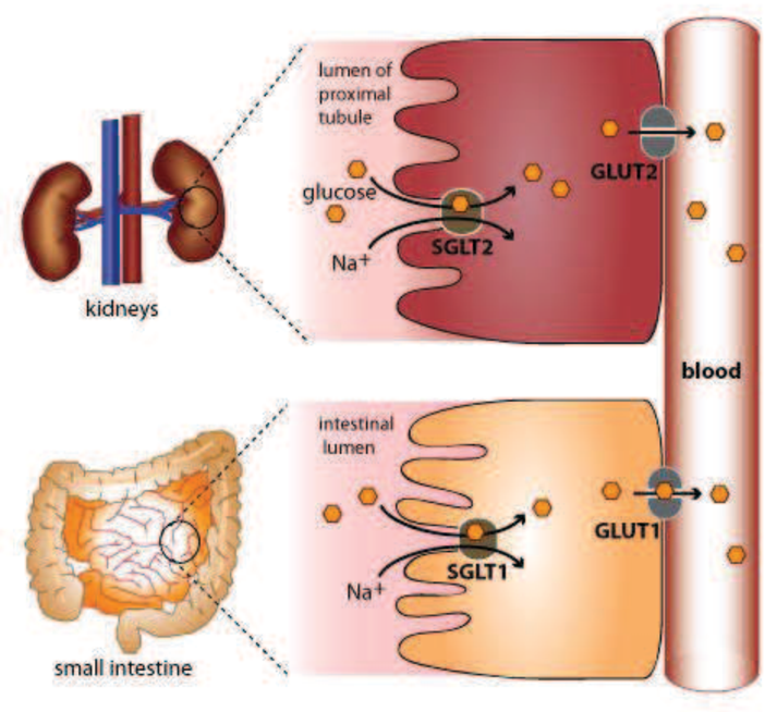 البروتين اللي موجود في الكلى ليه دور مختلف و هو انه بعد ما الدم بيتفلتر في الكلية من كل الاملاح والمواد العضوية اللي فيه ، بيكون ضروري ان الجسم يرجع يمتص تاني الملاح و المواد العضوية الضرورية قبل ما يتم اخراجها في البول وهنا ييجي دور ال SGLT عشان يقوم باعادة امتصاص الجلوكوز و الصوديوم . SGLT بيعيد امتصاص كل كمية السكر اللي تم فلترلها قبل كدا و يلحقها قبل ما تخرج من الجسم و يرجع يمصها للدم تاني ، في العادي دي شئ مهم لأنه بيحافظ على مستوى السكر في الدم ، و مفروض ان الانسولين مسؤول بقى انه يتولى مهمة خفض مستوى الجلوكوز في الدم لو زاد .