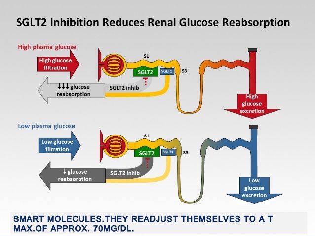 ومن هنا يظهر فكرة انه لو في مادة شبه الجلوكوز كانت متفلترة وموجوده في البول وعندها القدرة انها تمسك في الSGLT-2 اكتر من الجلوكوز نفسه ساعتها نسبة الجلوكوز اللي هيتم التخلص منه هتزيد و بالتالي نسبة الجلوكوز في الدم هتقل . وهو دا بالضبط اللي بيعمله مضادات بروتين ال SGLT2 .