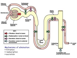 هنركز شوية جوه الكلى و هنلاقي ان بعد ما بيتم الفلترة الأولى بتحصل في بيمشى البول في خلية الكلى في طريق و بيتم اعادة امتصاص الصوديوم في ٣ اماكن الانابيب القريبة Proximal Tubule – التواء هنل Loop of hennel – و الانبيب البعيدة Distal Tubules و بعد كده يتجمع عشان يخرج للمثانة