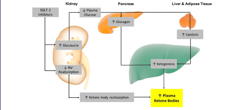 ولكن في بعض الحالات القليلة بتظهر ال Ketonacidosis أو تكوين اجسام كيتونية كطريقة لتعويض نقص الجلوكوز في الدم، الاثر دا بيحتاج لبيئة فيها حمضية قوية و دا بيسبب الجليفلوزين كمان ، الأثر الجانبي هنا بيظهر كنوبة حادة من القيء و الاسهال مع ضعف عام و الم في العضلات ممكن توصل لغيبوبة وومكن تكون قاتلة