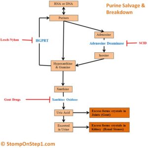 عملية تكسير الNucleotide بتتم في خطوات كتير لحد ما بنوصل لشكل بدائي اللي هو ال Uric acid سهل الكلى تتخلص منه في البول .