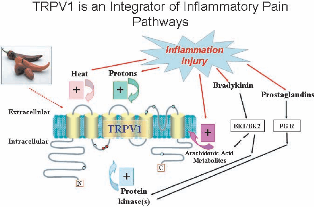 اكتشاف قناة TRPV1 (Transient Receptor Potential Vanilloid 1) كان إنجاز محوري في فهم كيفية إحساس الجسم بالحرارة والألم. في عام 1997 قدر العالم الأمريكي ديفيد جوليوس انه يحدد المستقبل اللي يمكن تنشيطه عن طريق المواد الحارة زي مستخلص الفلفل الحار Capsaicin والحرارة، ودا عمل ثورة في مجال البيولوجيا الحسية. ، جوليوس أخذ جائزة نوبل في الطب لعام 2021 بالمناصفة . و الاكتشاف دا مهد الطريق لعلاجات جديدة في إدارة الألم.