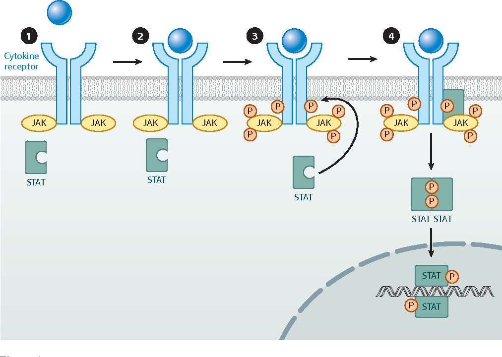 لما السيتوكين يرتبط بالReceptor على السطح الخارجي للخلية، ده بيؤدي لدمج الوحدتين بتوع المستقبل مع بعض، والنتيجة إن جزيئات الـ JAK بتتقابل وتبدأ تتفعل و تعمل عملية Phosphorization (تضيف مجموعة فوسفات) لوحدات مستقبل السيتوكين عند مواقع التيروسين. عملية الفسفرة دي بتعمل إشارة بتجذب بروتينات تانية موجودة في ال Cytoplasm اسمهم “signal transducer and activator of transcription” أو (STAT) عشان ترتبط بالreceptor وهو متفسفر. وساعتها الـJAK هيفسفر الSTAT نفسها و تتحول لنسخة مفعلة .