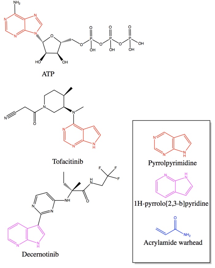 Tofacitinib هو مثبط عام لـ JAK1 و JAK2 و JAK3، وده بيساعده على تثبيط مجموعة واسعة من مستقبلات السيتوكين ودا بيقوي الفعالية و كمان بيزود الآثار الجانبية .وزي ما قلنا المادة الفعالة دي فيها تشابه هيكلي مع الـATP.