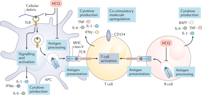 تراكم الHCQ جوه الEndosomes هيسبب تغييرات كتير منها انه هيغير الP.H. بتاع الEndosome من Acidic ل Basic . وكمان هيعطل مستقبلات ال TLR بشكل يخليهم مش قادرين يرتبطوا بالـ DNA أو RNA ، زي ما تكون حاطط كاتم صوت على جرس إنذار. وبتقليل نشاط للـ TLR بقل الالتهاب و يقل افراز الانترفيرون و الCytokines ، وده بيقلل نوبات الذئبة .