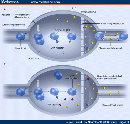 الS1P ليه مستقبلات على خلايا الLymphocytes زي الT-cells و الB-cells . ولما الS1P يمسك في المستقبل بتاعه على الخلايا دي بيوجه حركة الخلية من العقد الليمفاوية للدم عشان الجسم يوديها مكان العدوى أو الخطر