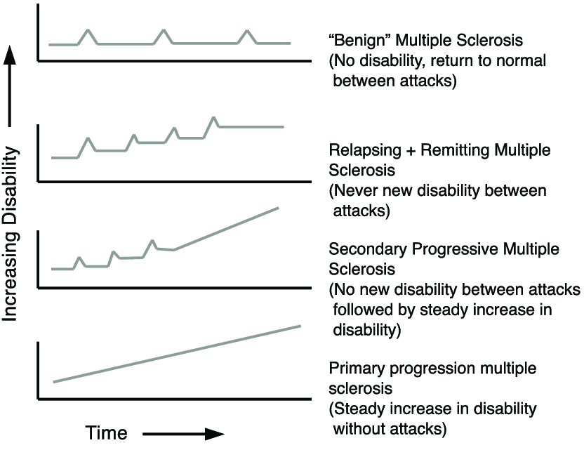 المرض ليه ٤ أنواع فرعية مختلفة حسب نمط الاعراض و هل بيرجع المريض بعد النوبات طبيعي و لا بتأثر عليه و ازاي بيتطور المرض الوقت . الانواع دي بيوضحها الشكل اللي جاي دا . النوع الأكثر شيوعا هو الRelapsing remitting ودا بيمثل تقريبا ٨٥٪ من الحالات . و الادوية اللي هنتكلم عنها النهارده بتساعد في النوع دا . باقي الأنواع ليها أدوية أخرى أتكلمنا عنها قبل كده هنا وهنا