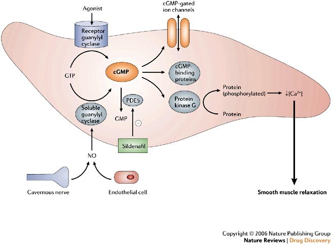 cGMP (Cyclic Guanosine Monophosphate) هو مركب له دورًا مهمًا في ارتخاء العضلات الملساء Smooth muscles في الاوعية الدموية و بالتالي لتوسيع الأوعية الدموية.