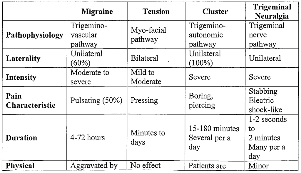 ألم العصب الخامس أو الـ Trigeminal Neuralgia ده اتكلمنا عليه في كلامنا عن الصداع النصفي .  لكن مرض ألم العصب الخامس مش هو نفسه الصداع النصفي .لأ دا واحد من أشد أنواع الألم المعروفة عند البشر . المريض بيحس بصدمة كهربائية مفاجئة في وشه ممكن تتحفز بأي حاجة بسيطة زي الأكل أو الكلام أو حتى لمس الوش . السبب هو فرط في نشاط العصب الخامس .بس الاختلاف في مكان و مدة الألم و قوة الألم . الحدول دا بيوضح الفرق بين الم العصب الخامس و اشهر أنواع الصداع